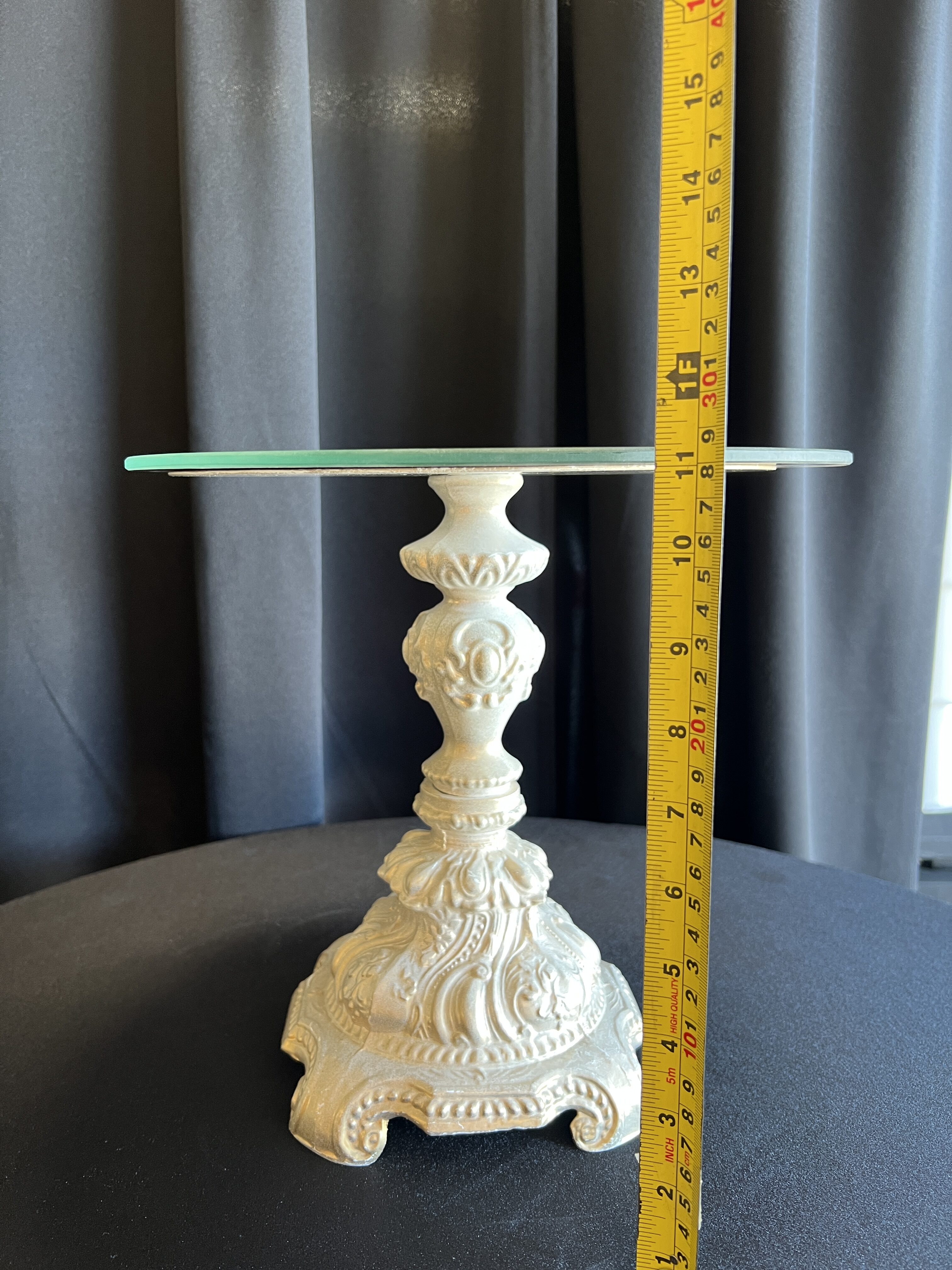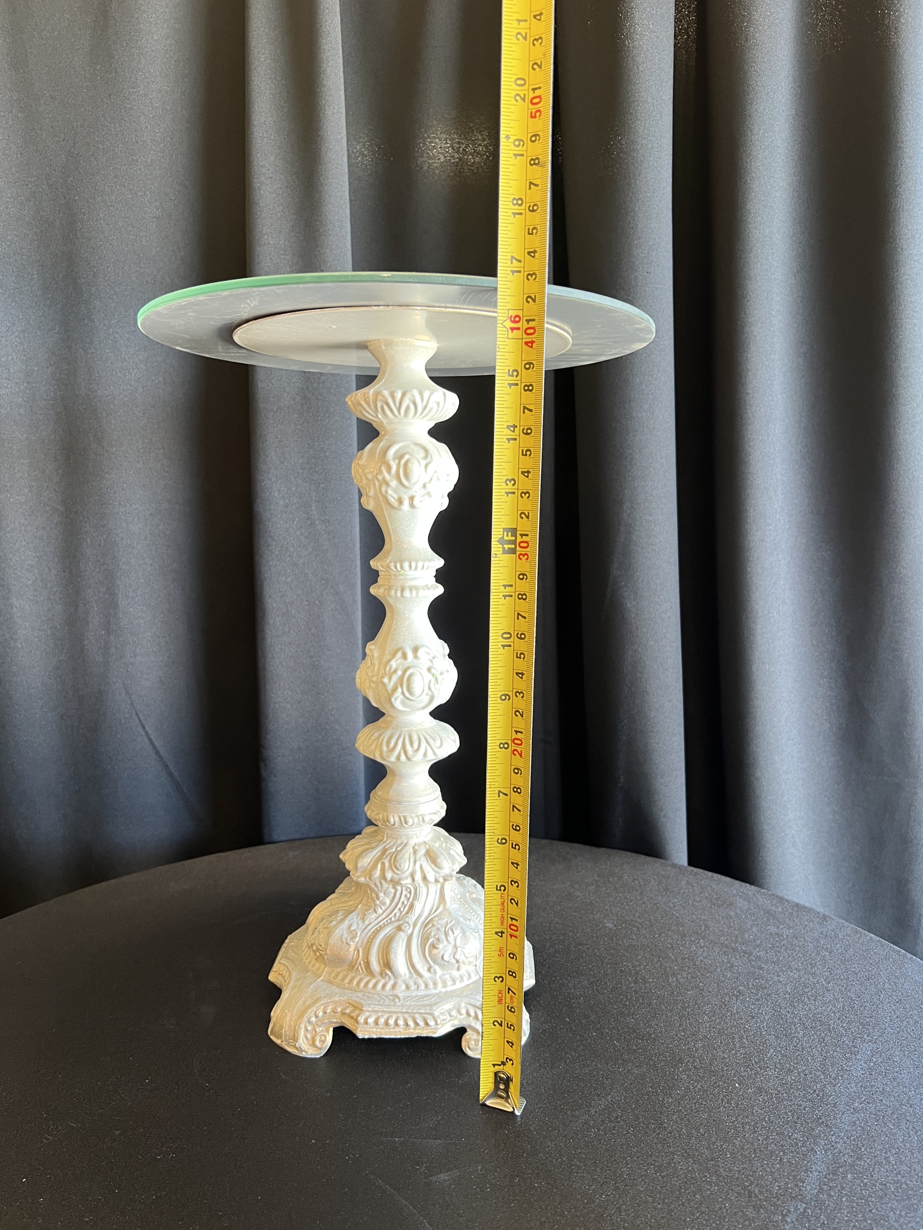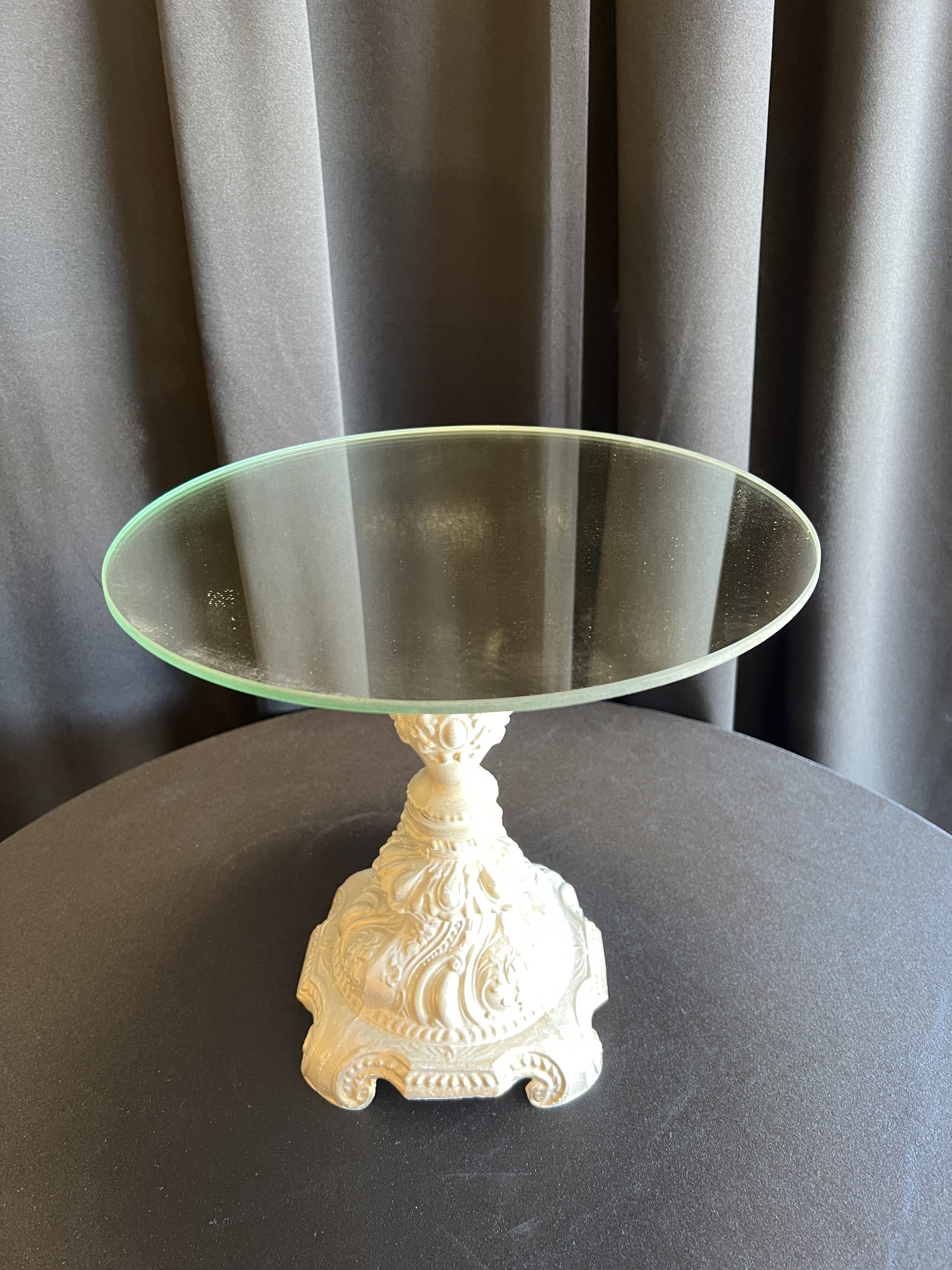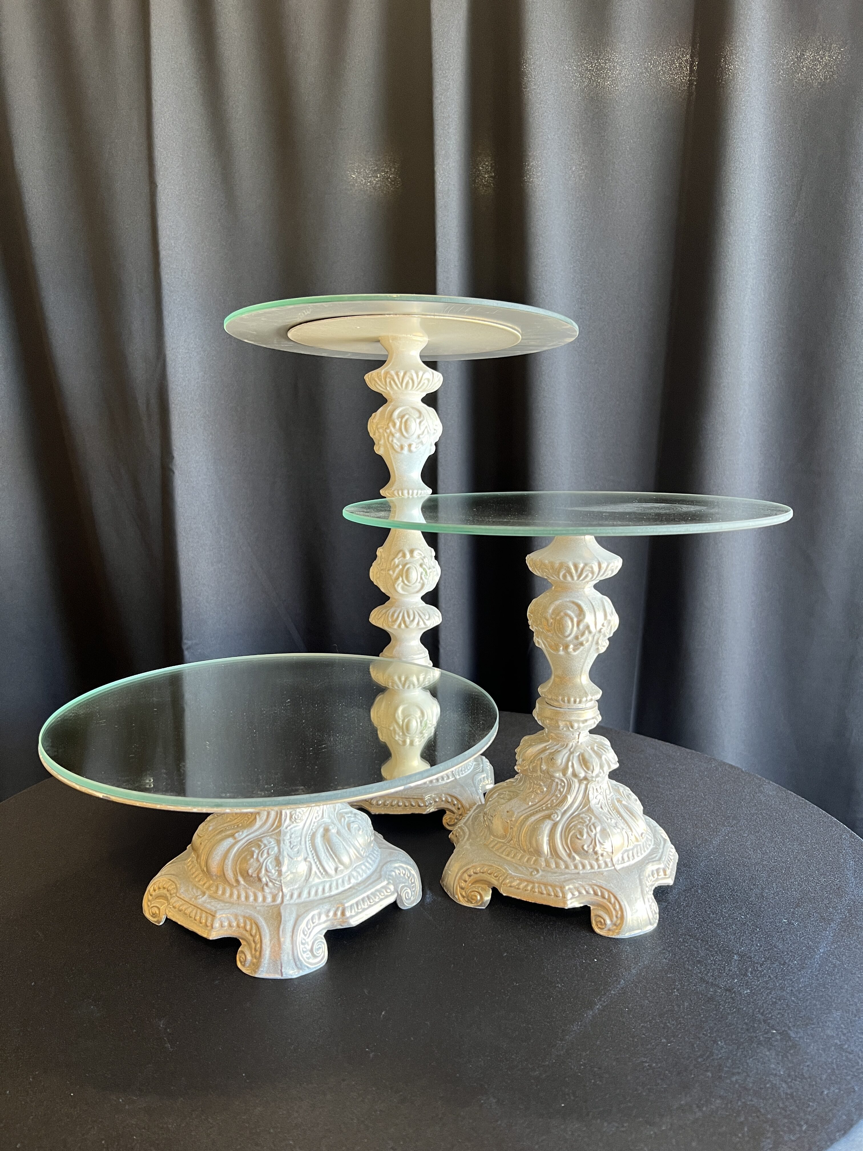 Tall ~ approx. 17″ tall Medium ~ approx. 11″ tall Small ~ approx. 5.5″ tall Mirror plates on top are 12″ across